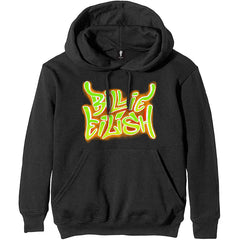 An official licensed unisex cotton Pullover Hoodie featuring the Billie Eilish 'Airbrush Flames Blohsh' design motif. This high quality garment is available in a black colourway.Long sleeved cotton hoodie with pouch pockets.