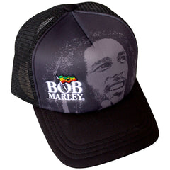 An official licensed Bob Marley- Logo & Face - Black OSFA Mesh Trucker Baseball Cap
