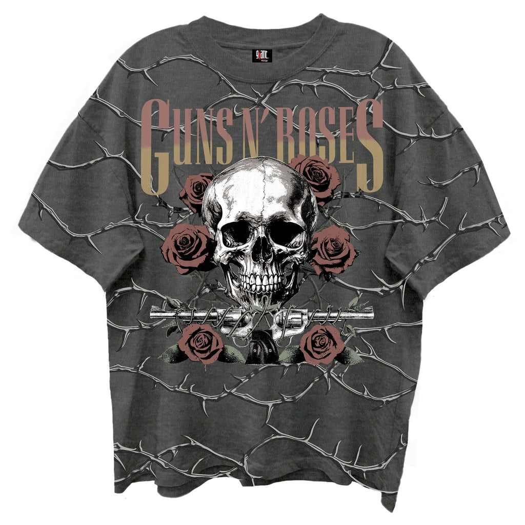 Guns N Roses - Skull Roses - Black Enzyme Wash Retro Style t-shirt