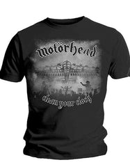 An official licensed unisex Cotton Tee featuring the Motorhead 'Clean Your Clock B&W' design motif. This high quality t-shirt is available in a black colourway.