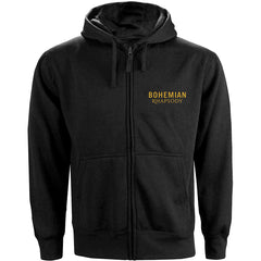 An official licensed cotton zipped hoodie featuring the Queen 'Bohemian Rhapsody Movie Poster' design motif. This high quality hooded top is available in a black colourway.