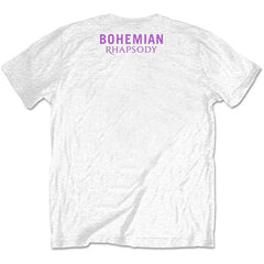 An official licensed unisex soft-style cotton Tee featuring the Queen 'Bohemian Rhapsody' design motif. This high quality t-shirt is available in a white colourway.