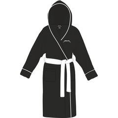 Black hooded robe in super soft fleece toweling with white piping, belt, breast and back logos.