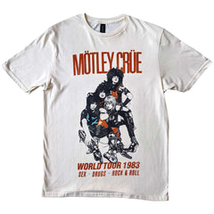 An official licensed unisex soft-style cotton Tee featuring the Motley Crue 'World Tour Vintage' design motif. This high quality t-shirt is available in a white colourway.Here's some more stuff you might like:
