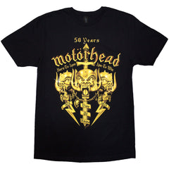 Official licensed Motorhead Unisex T-Shirt featuring the '50 Years Swords & Warpig' design motif. High quality T-Shirt available in a black colourway.