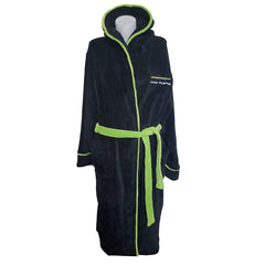 Black super soft fleece hooded robe with contrasting green piping & belt. Features embroidered design motifs to front & silk-screen print to back.