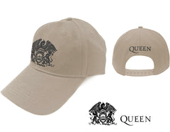 An official licensed unisex cotton Baseball Cap featuring the Queen 'Black Classic Crest' design motif. This high quality headwear is available in a sand